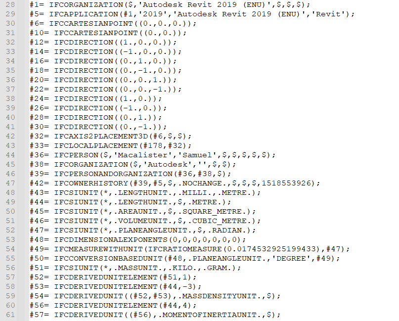 Plik IFC możemy również otworzyć w edytorze tekstowym i zobaczymy mniej więcej to: