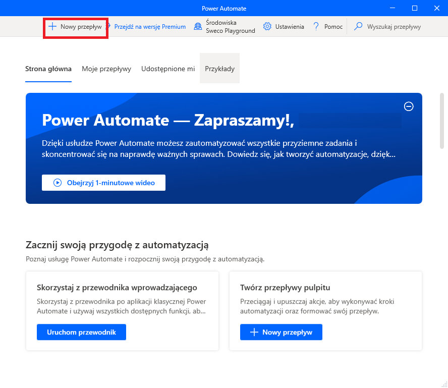 Zaczynamy od otworzenia aplikacji na komputer. Następnie klikamy Nowy przepływ.