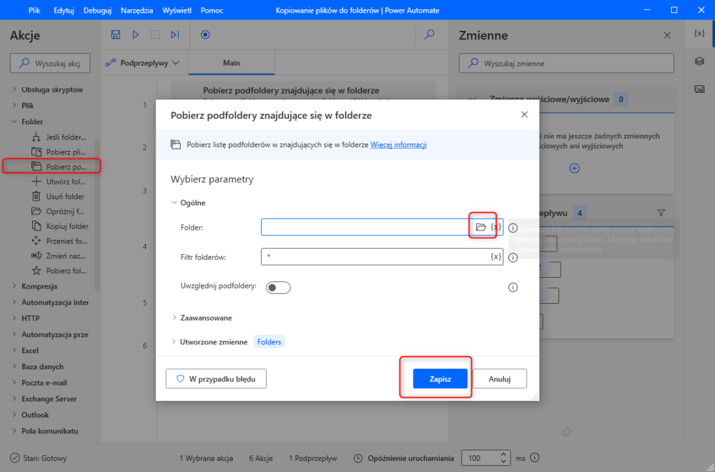 W liście dostępnych funkcji/akcji wybieramy folder a następnie „Pobierz podfoldery znajdujące się w folderze”