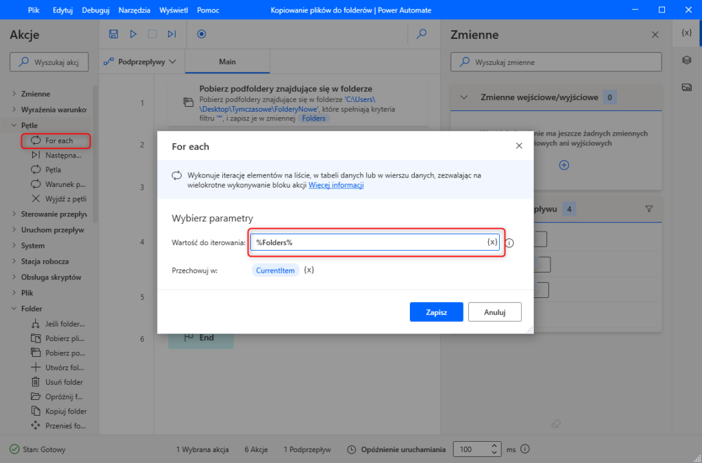W naszym przypadku wartość iterowaną w pętli będzie zmienna „Folder” którą utworzyliśmy pobierając foldery.