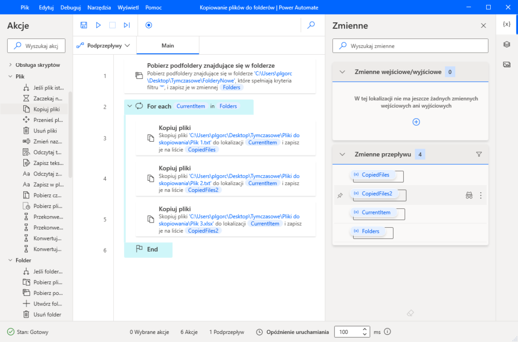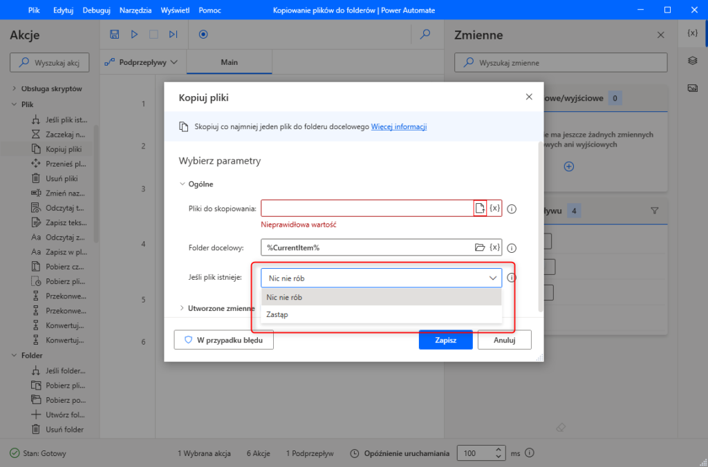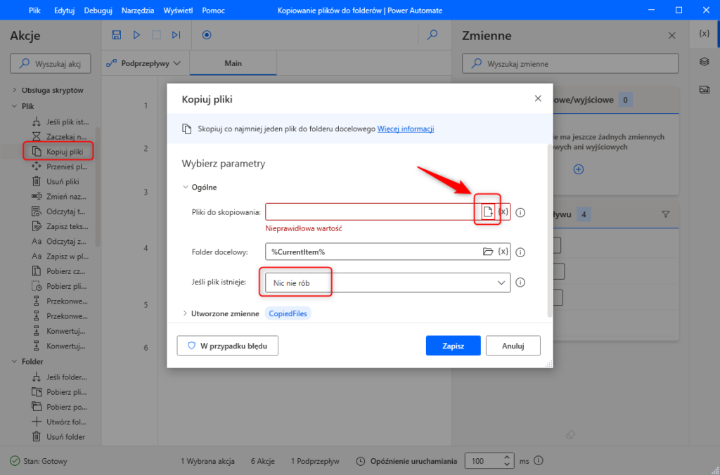Wewnątrz pętli dodajemy funkcją z zakładki „plik” o nazwie „Kopiuj pliki”.